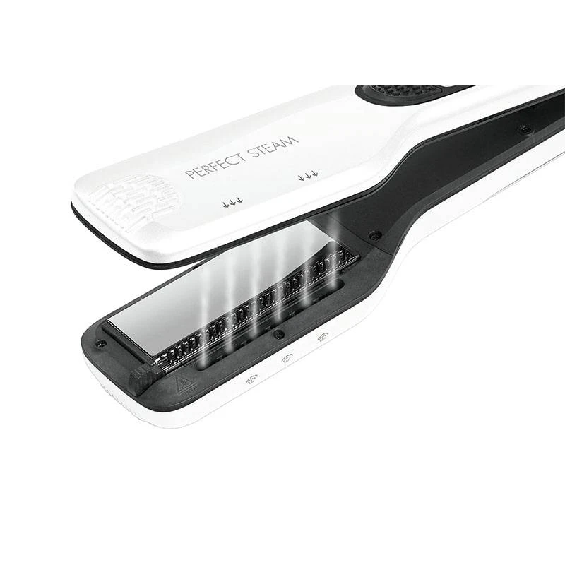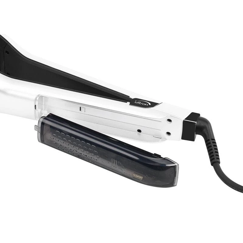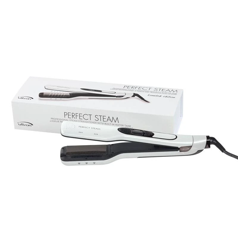 La fonction vapeur unique de l?Ultron Perfect Steam Pearl permet d?hydrater les cheveux durant le lissage. Ce qui va permettre d?empêcher les cheveux de se dessécher sous la chaleur des plaques. Le Perfect Steam permet d?obtenir un résultat anti statique avec un rendu éclatant. De plus il possède un peigne fin amovible intégré, ce dernier va démêler la chevelure durant le lissage ce qui va garantir une répartition uniforme des cheveux sur les plaques et donner un résultat unique. Les cheveux vont tomber de manière plus naturelle qu?après un lissage classique. Doté de son réservoir d?eau facile à remplir qui est incorporé dans son manche et de son câble d?alimentation d?une longueur de 2,8 mètres il offre une très bonne maniabilité. Il s?adapte à tous types de cheveux, grâce à ses plaques flottantes en titane et à ses 5 niveaux de températures. Avec sa technicité, ce produit convient très bien à un usage professionnel.