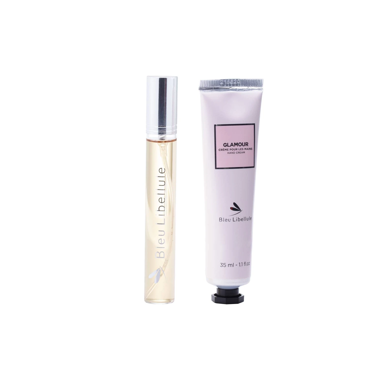 Ce mini coffret Glamour de chez Bleu Libellule est idéal pour emporter votre parfum préféré partout avec vous, et prolonger l’expérience parfumée grâce à la crème pour les mains parfumée.