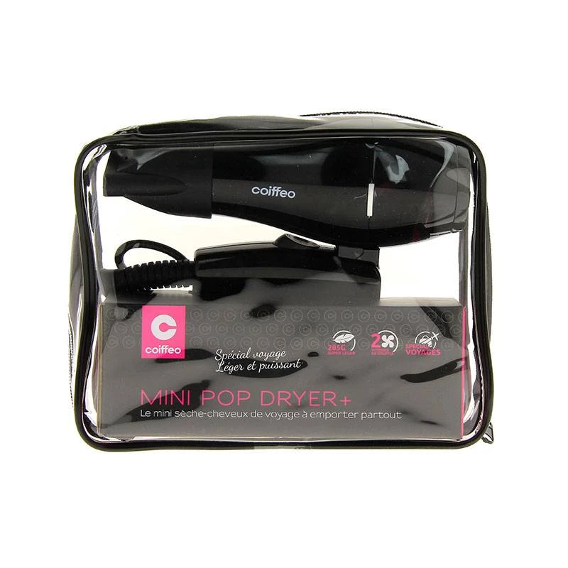 Le mini sèche-cheveux Pop Dryer+ noir est le compagnon idéal de voyage. En effet, il se transporte facilement grâce à son manche pliable et peut donc se glisser dans toutes les valises.