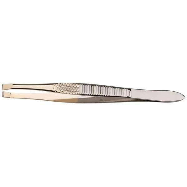 Pince à épiler dorée, à mors carrés de 9,5 cm.