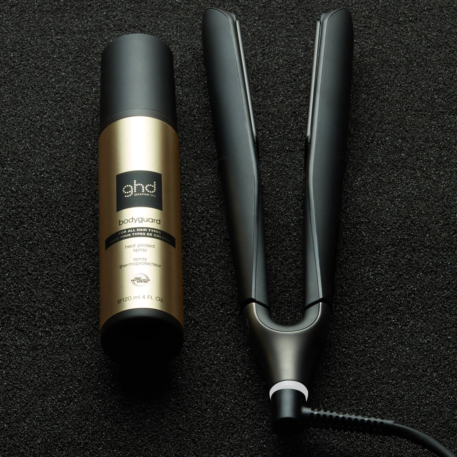 Découvrez le dernier styler® de ghd : Chronos, un lisseur 3x plus rapide* pour des résultats haute définition durant 24h** et en un seul passage, accompagné du spray thermoprotecteur Bodyguard All hair types spécial tout type de cheveux.