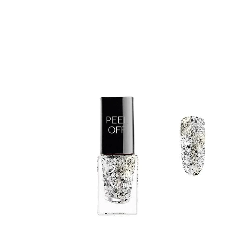 Sur ongles démaquillés et dégraissés, appliquez directement le vernis Peel-Off Silver Glitter sur l’ongle en deux couches.